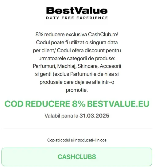 Dacă dorești să ai acces nelimitat la coduri și cupoane de reducere la peste 1000 de magazine partenere + bani înapoi la fiecare cumpărătură, creează-ți cont gratuit pe CashClub aici.