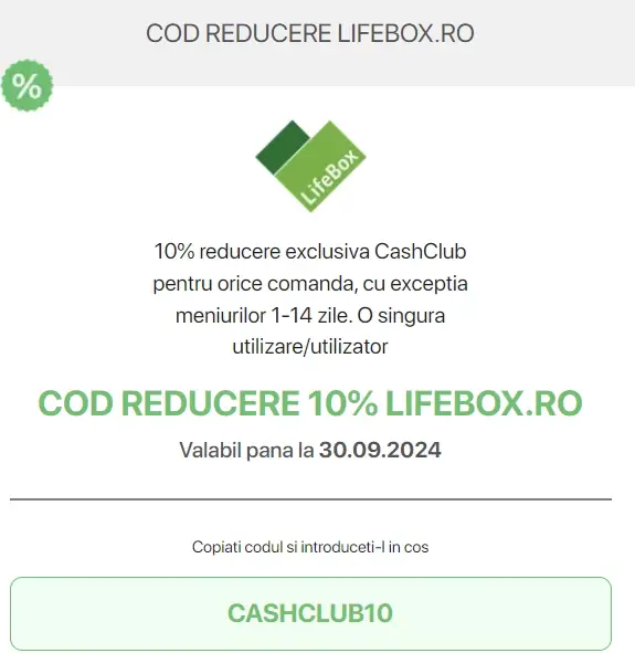 Nu uita sa folosesti acest cod de reducere exclusiv prin CashClub pentru LifeBox pentru o reducere de 10% la meniurile prezentate!